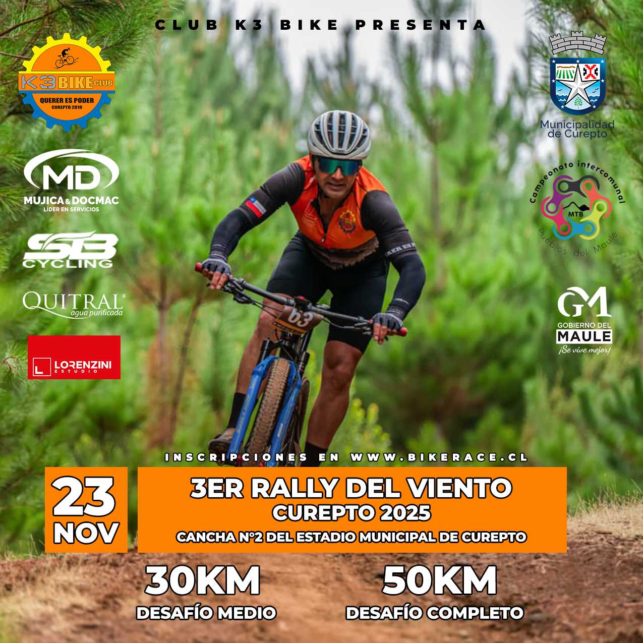 Como club deportivo K3 Bike, dejamos la invitación para asistir al 3er Rally del viento Curepto 2025, donde podrán disfrutar de diferentes paisajes y de distintas especies arbóreas, entretenidos senderos que hacen conexión entre los cerros de la comuna, teniendo como eje central nuestra torre forestal, desafío icónico y eje central de las rutas de ciclismo de la montaña en el sector. Desafío apto para todo competidor con alrededor de 30 kms con 900 mts de altimetría en su medio desafío y 50 kms con 1350 mts de altimetría acumulada aproximadamente. Te esperamos, Club deportivo K3 Bike de Curepto.