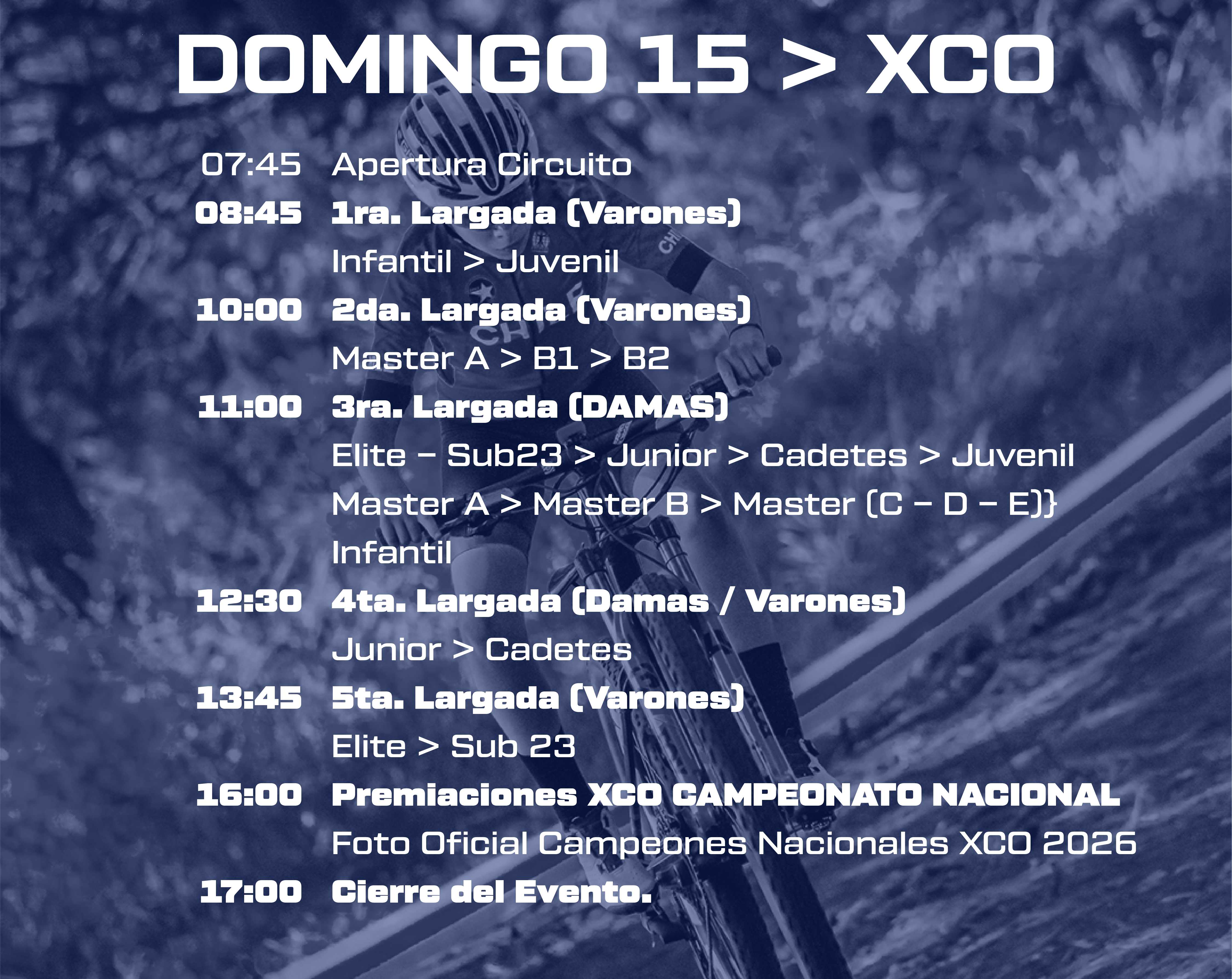 La Escuela de Ciclismo de Talcahuano, en conjunto con la Corporación Deportiva de San Pedro de la Paz y la Productora Olimp Sport SPA, con el patrocinio de la Federación de Ciclismo de Chile, invita a todos los corredores y corredoras del país a participar en el Campeonato Nacional XCC – XCO – XCE 2026.